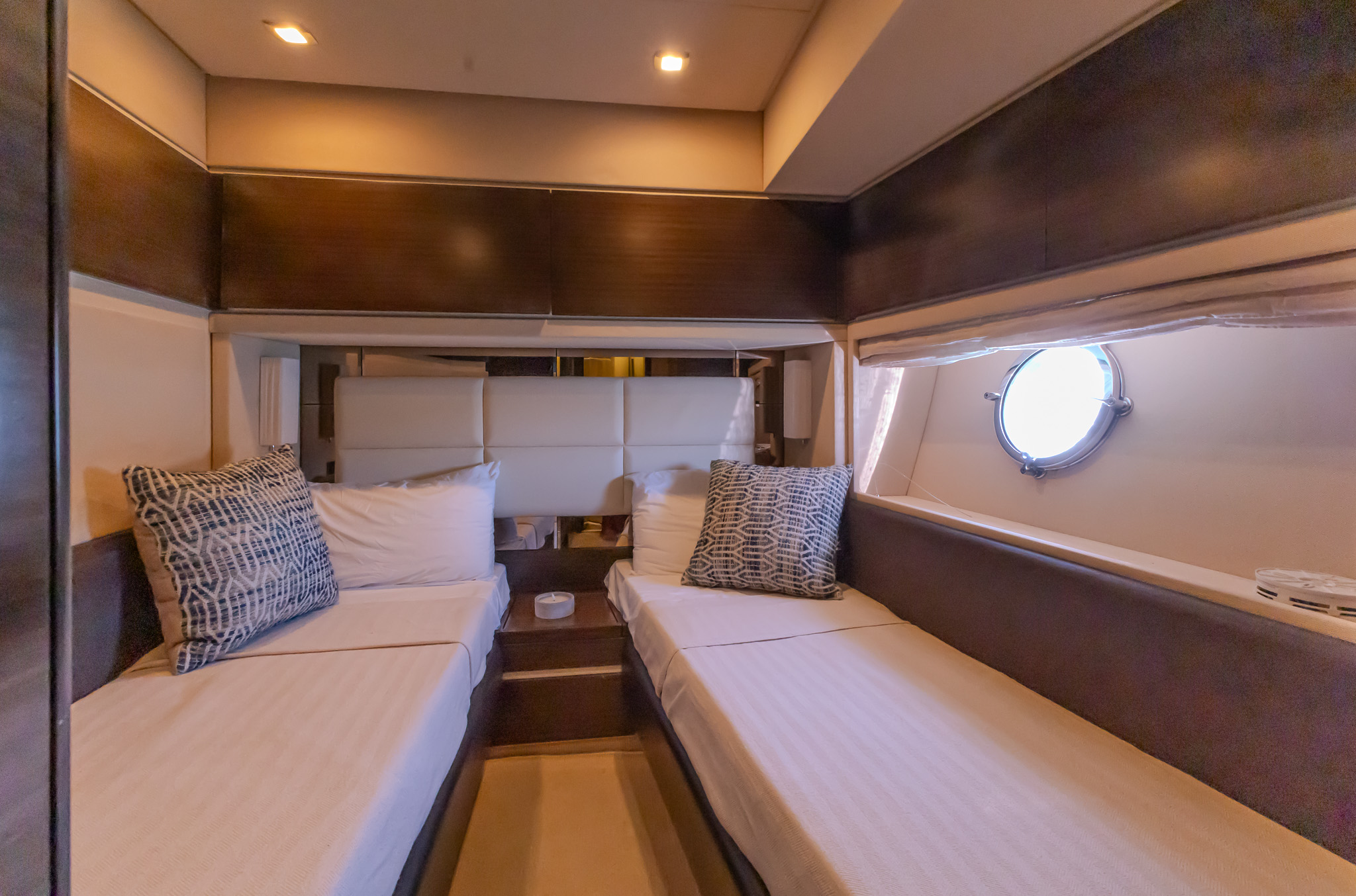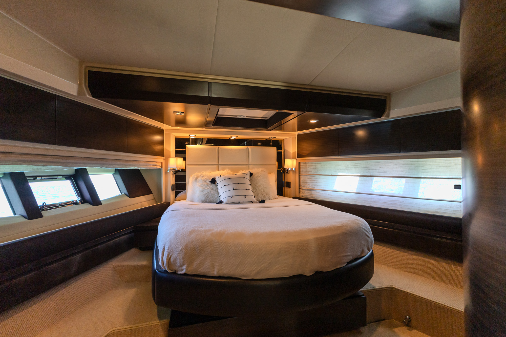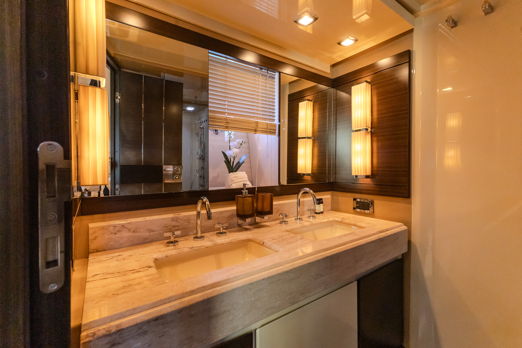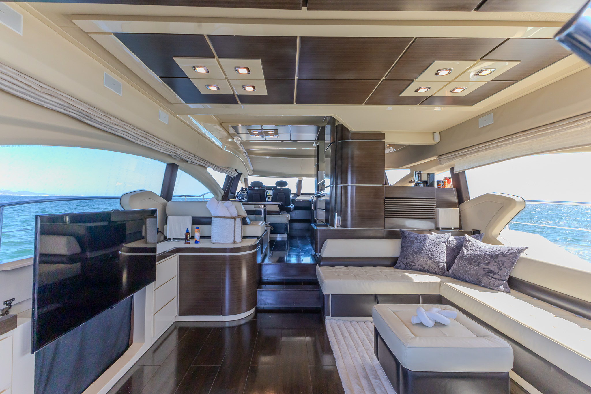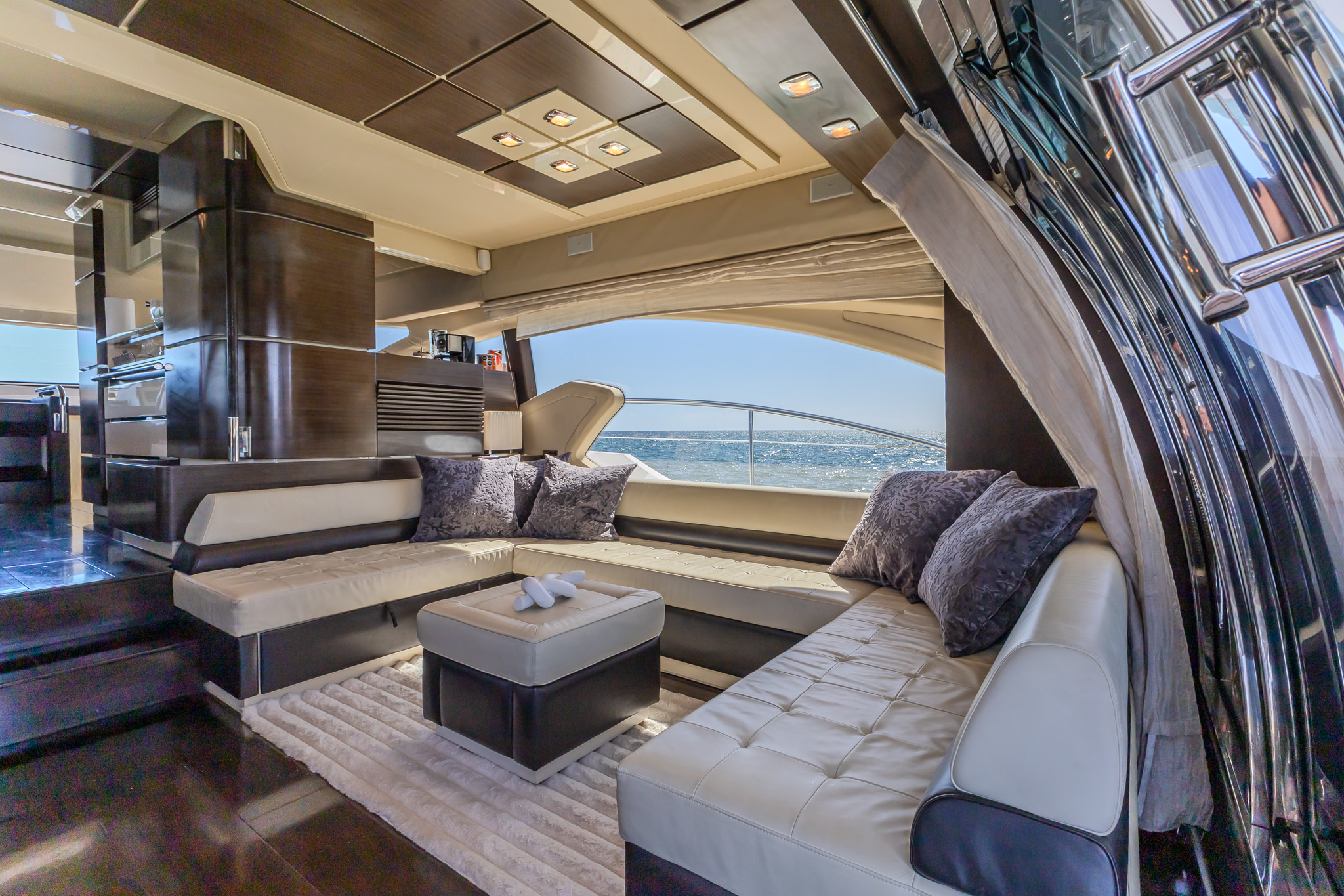 The flybridge is designed for both socializing and relaxation, featuring sun loungers, shaded seating, and breathtaking panoramic views—ideal for al fresco dining or soaking up the sun. Inside, the main salon boasts floor-to-ceiling windows, high-end finishes, and plush furnishings, creating a sophisticated yet inviting atmosphere for guests to unwind in style.