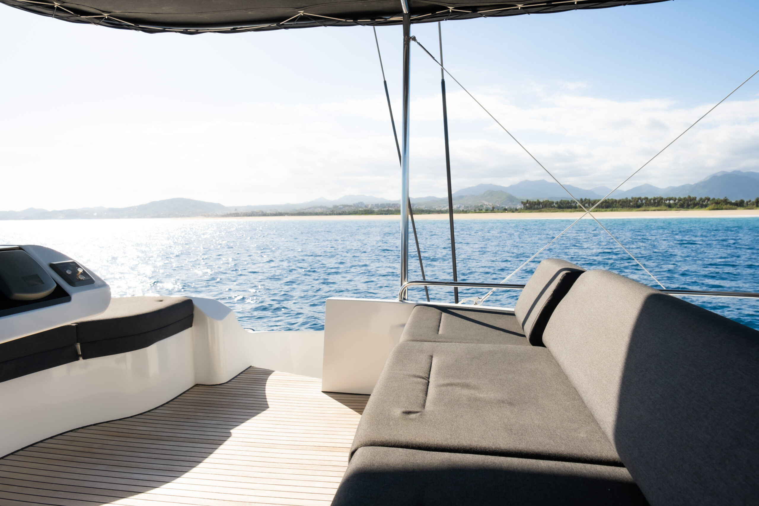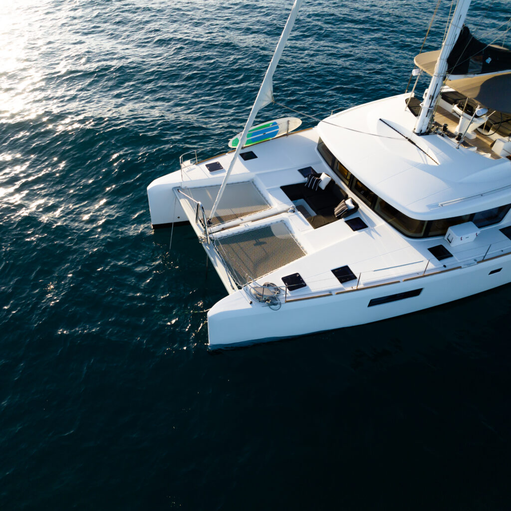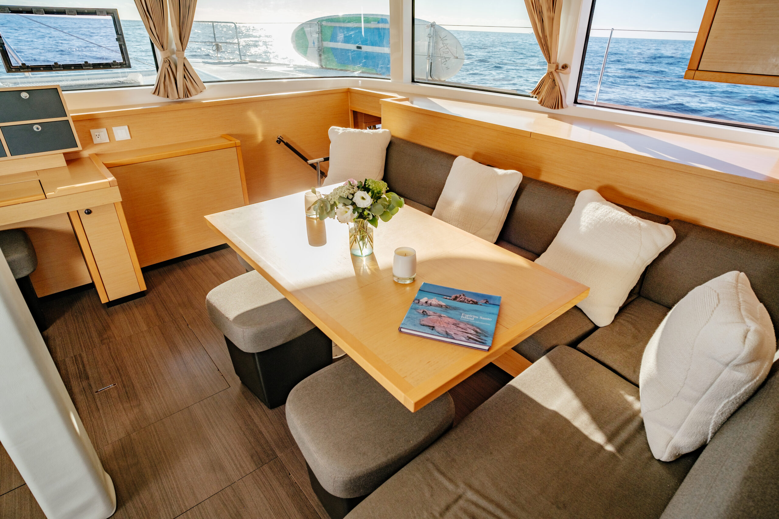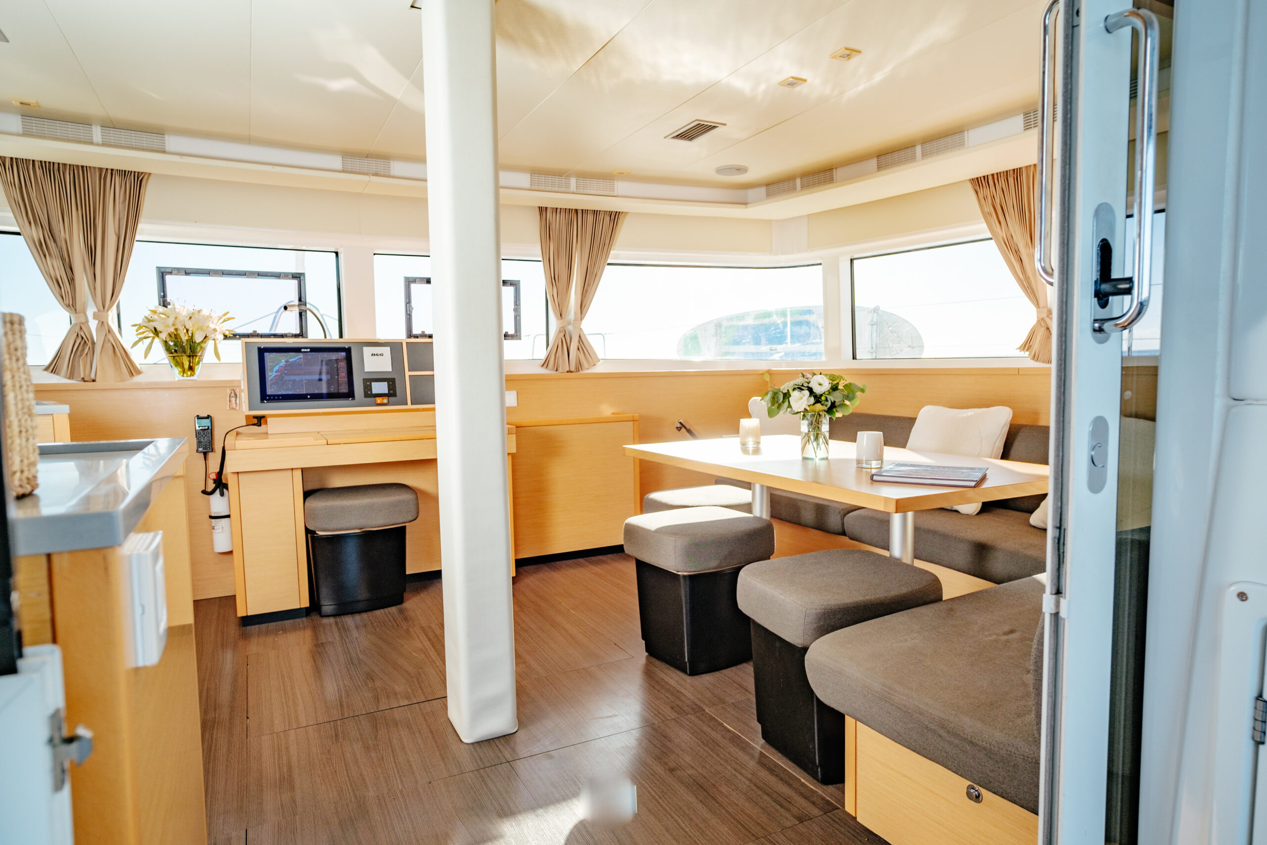 The Lagoon 52 heralds a new era in the evolution of cruising catamaran design. Every element is meticulously fashioned to guarantee the utmost comfort and unparalleled enjoyment. The salon seamlessly merges the lounge and dining area, offering sweeping panoramic vistas. Furthermore, the outdoor lounge is thoughtfully appointed with a dining table, sun loungers, and a sunshade, fashioning an idyllic indoor/outdoor setting.