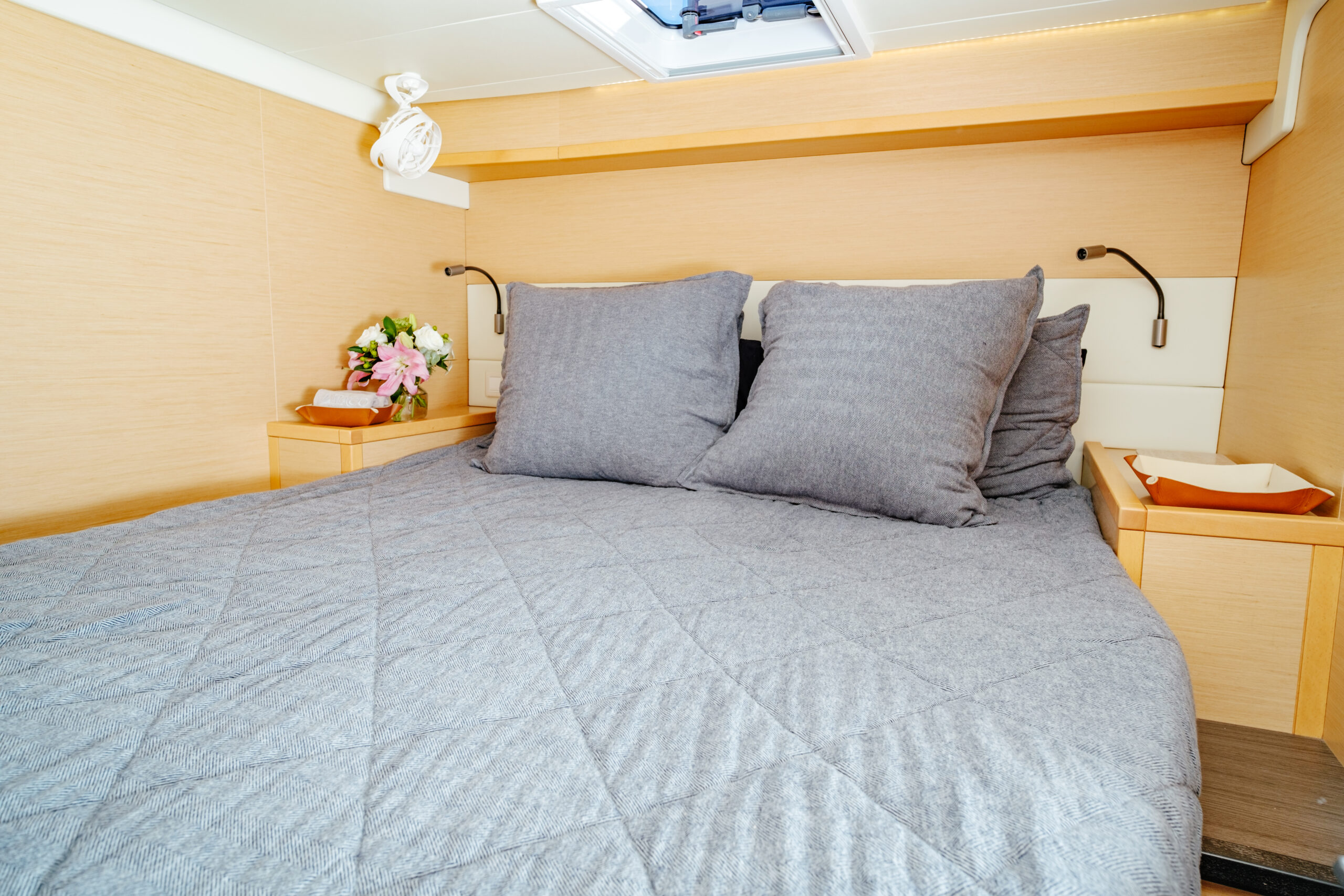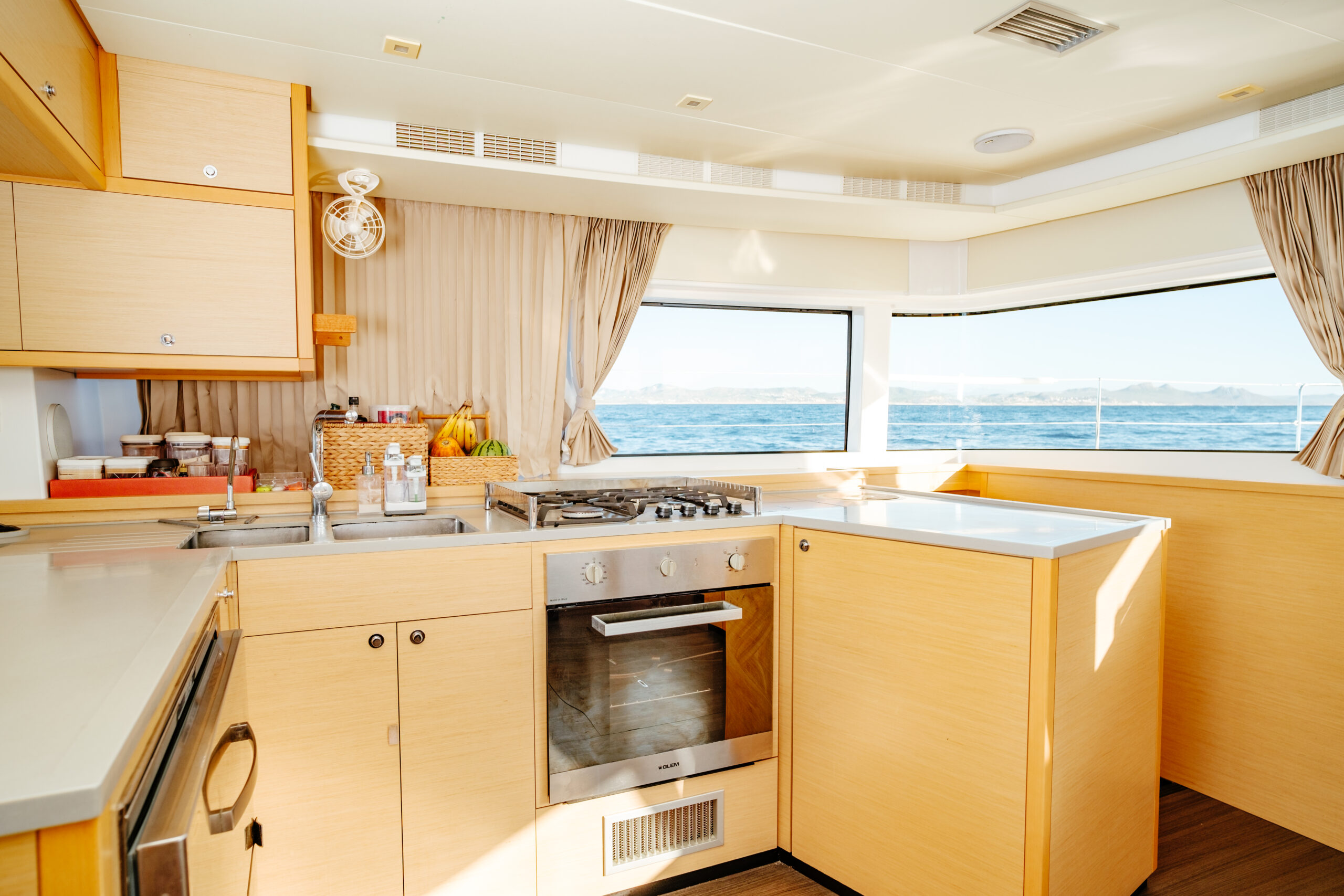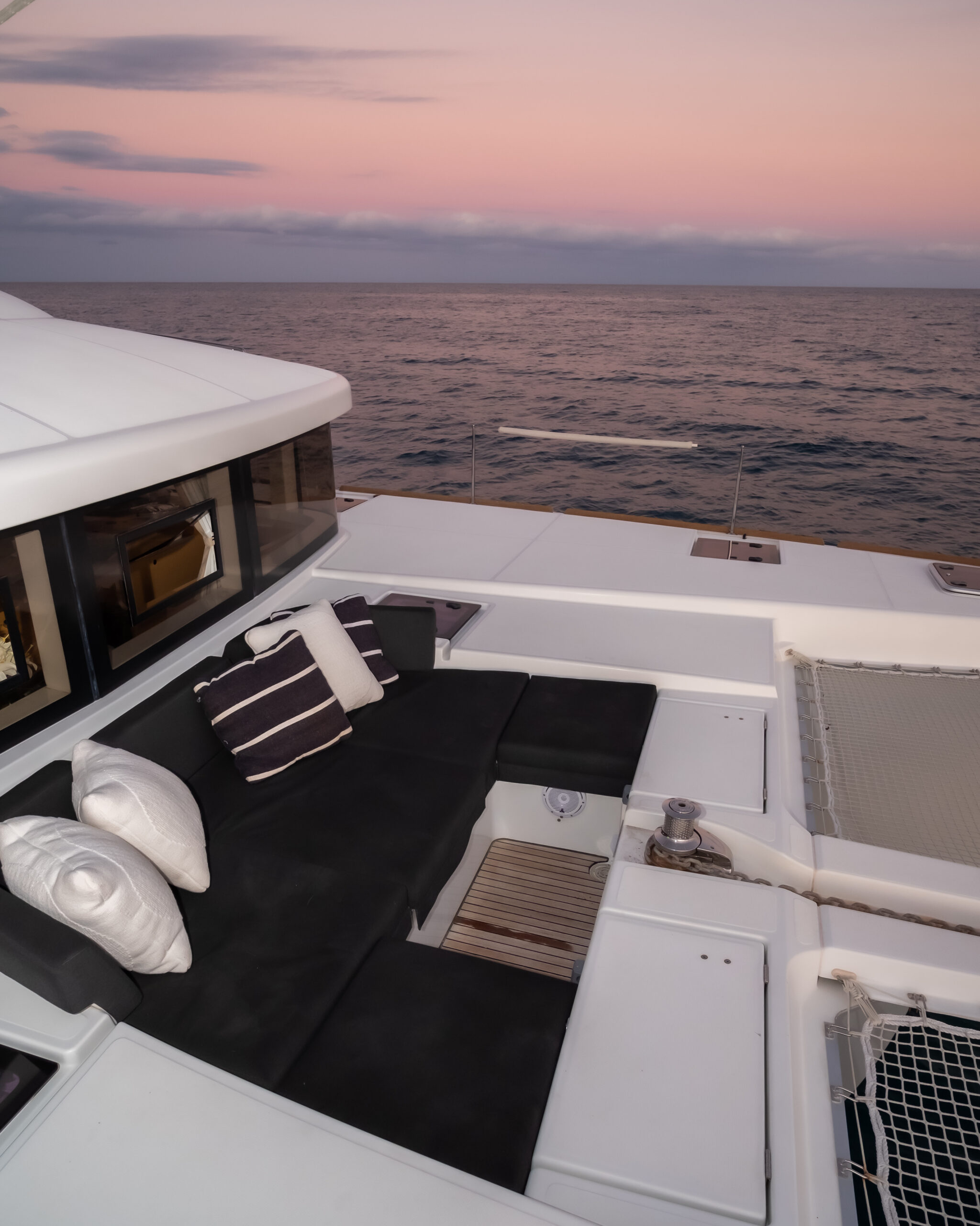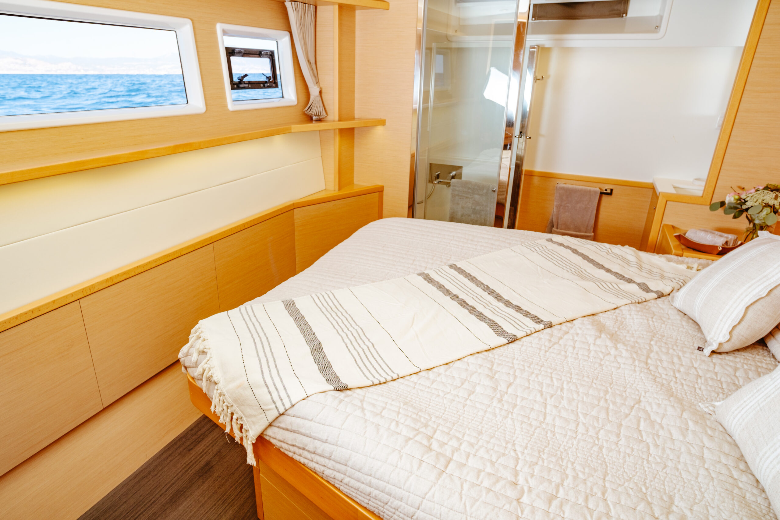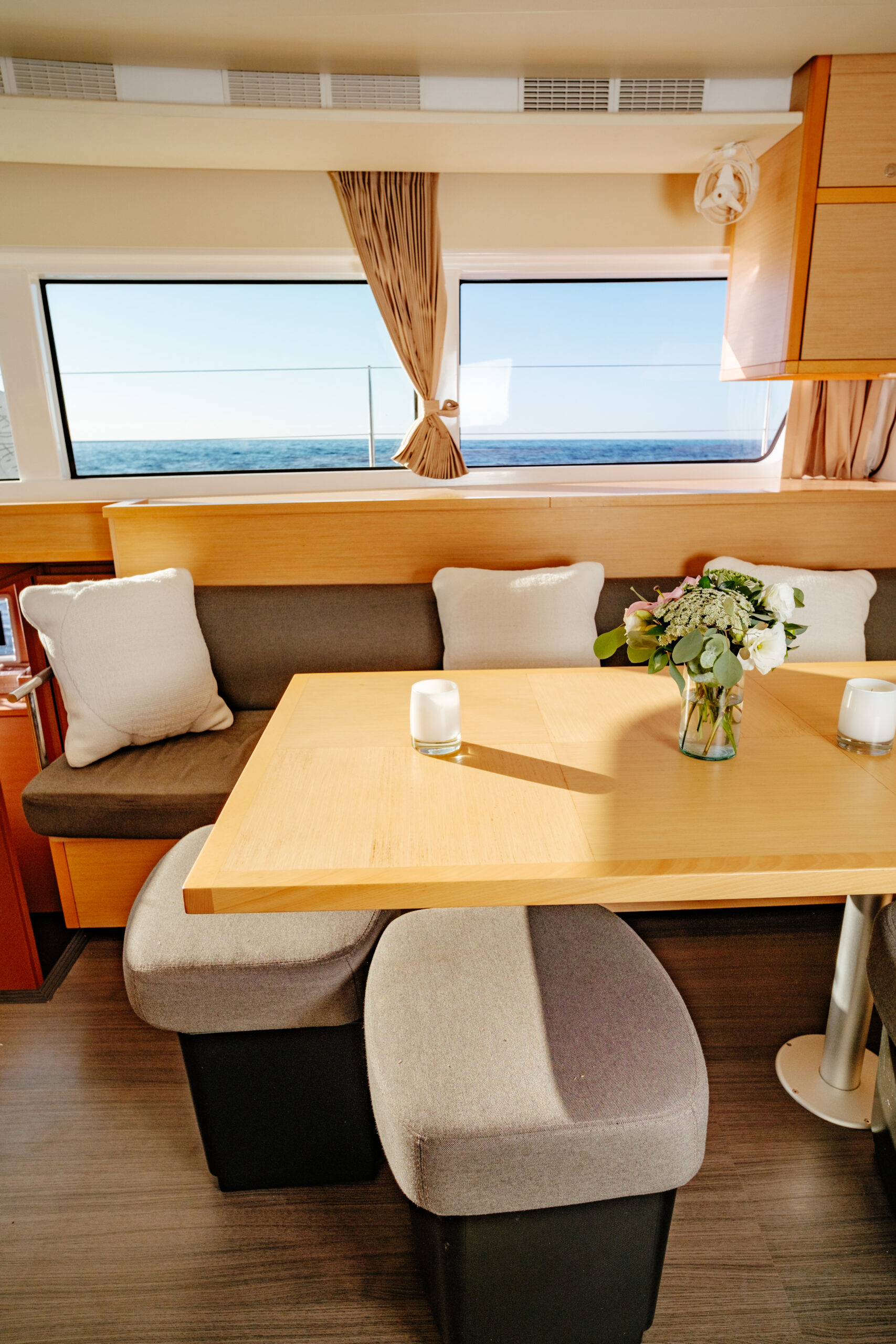 The Lagoon 52 heralds a new era in the evolution of cruising catamaran design. Every element is meticulously fashioned to guarantee the utmost comfort and unparalleled enjoyment. The salon seamlessly merges the lounge and dining area, offering sweeping panoramic vistas. Furthermore, the outdoor lounge is thoughtfully appointed with a dining table, sun loungers, and a sunshade, fashioning an idyllic indoor/outdoor setting.