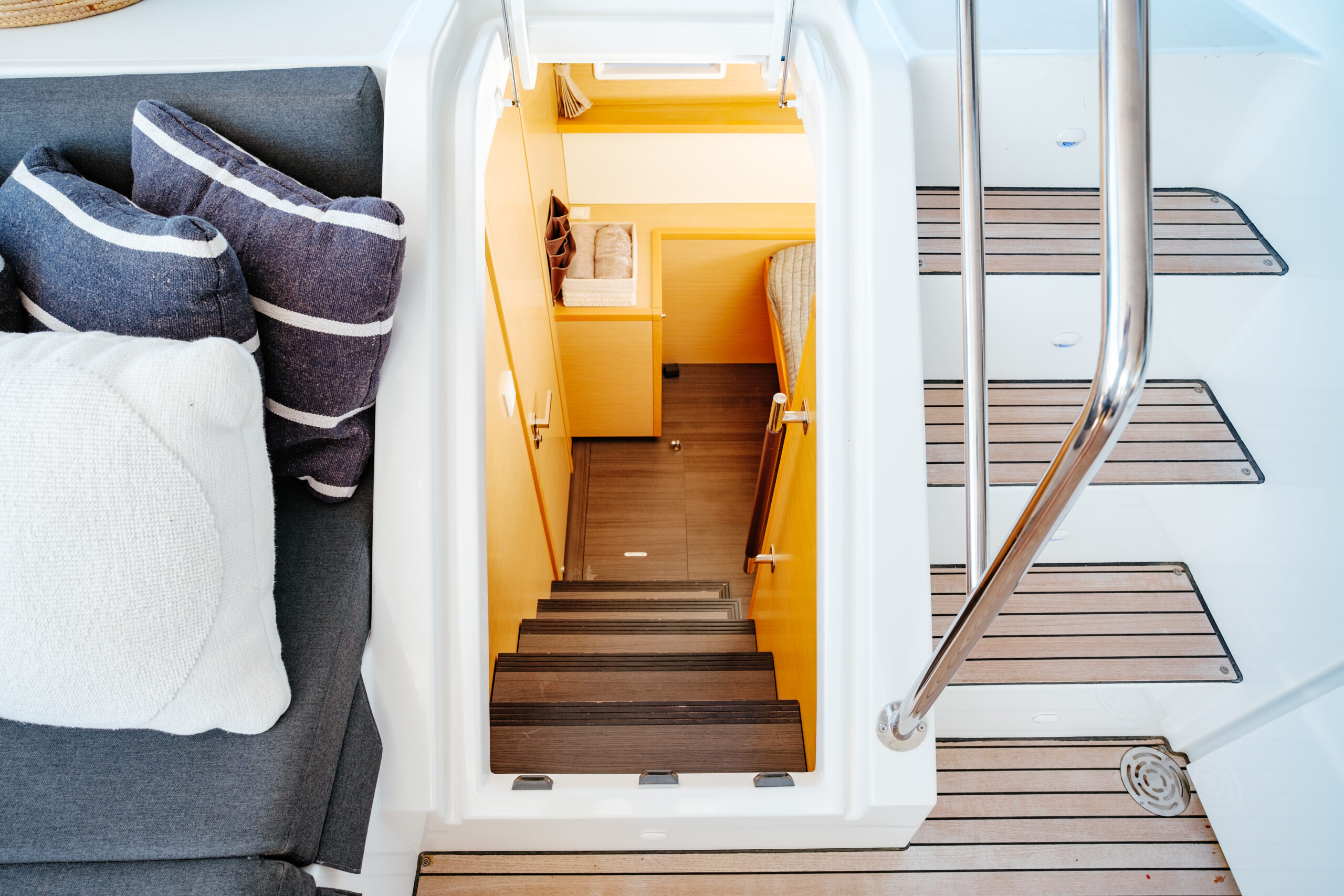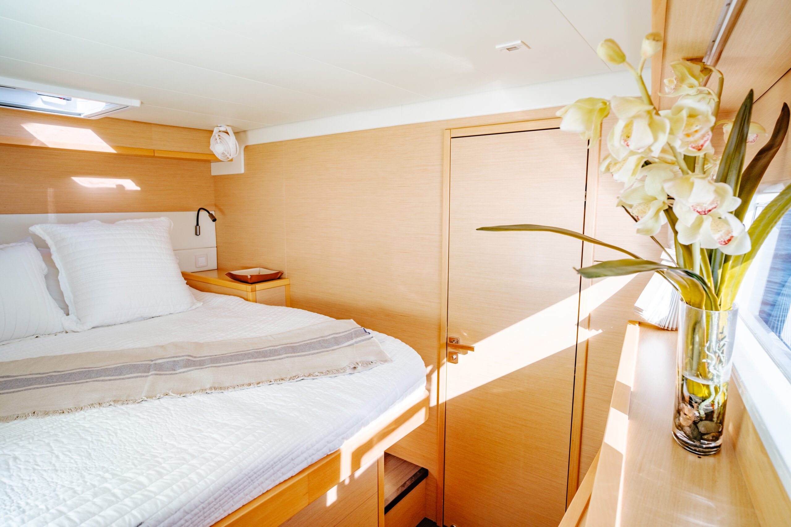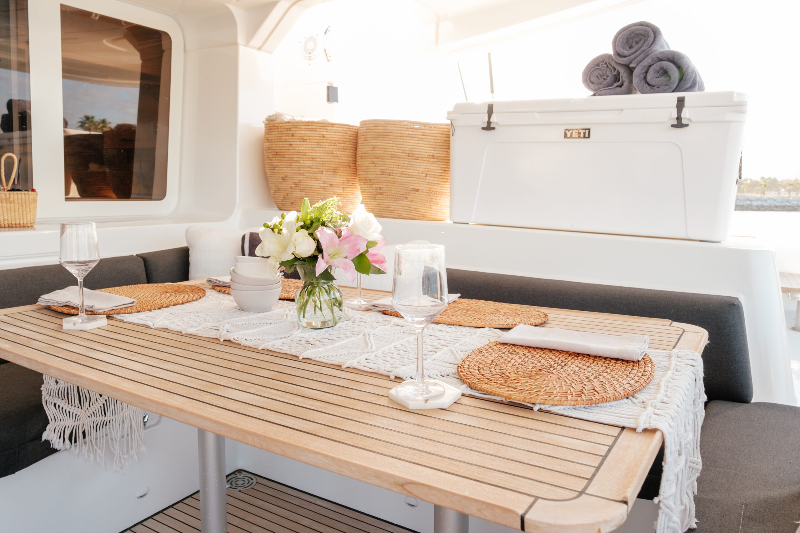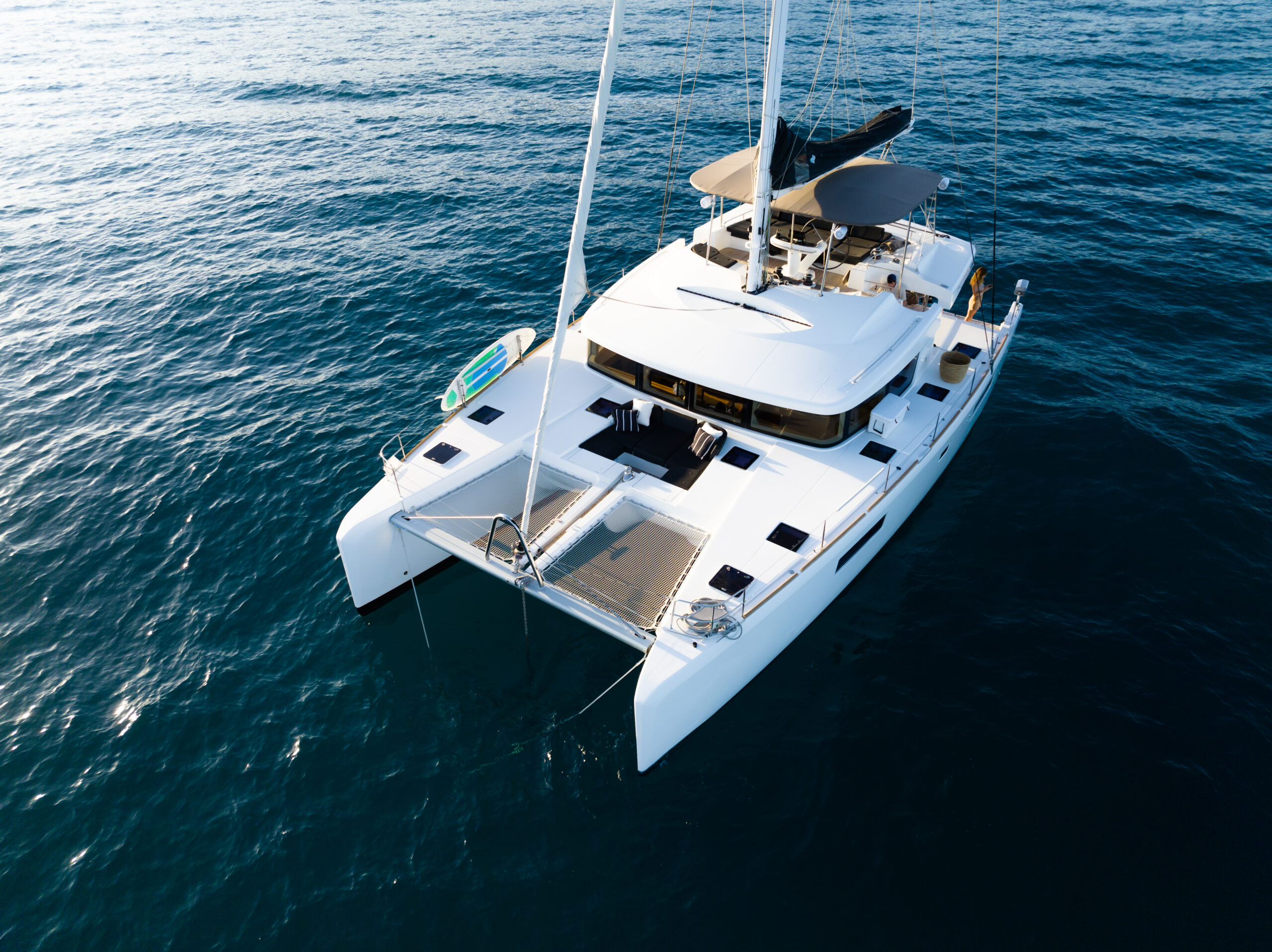 The Lagoon 52 heralds a new era in the evolution of cruising catamaran design. Every element is meticulously fashioned to guarantee the utmost comfort and unparalleled enjoyment. The salon seamlessly merges the lounge and dining area, offering sweeping panoramic vistas. Furthermore, the outdoor lounge is thoughtfully appointed with a dining table, sun loungers, and a sunshade, fashioning an idyllic indoor/outdoor setting.